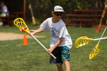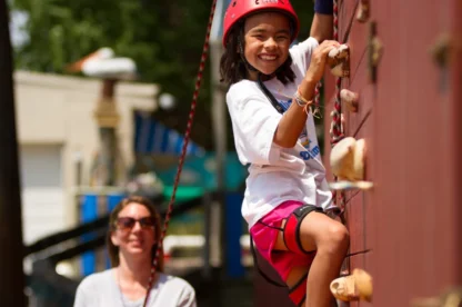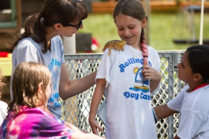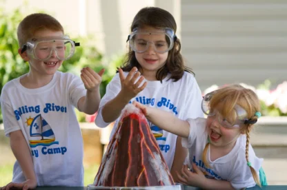 A small marina with boats docked along a calm river, surrounded by greenery and buildings under a blue sky.